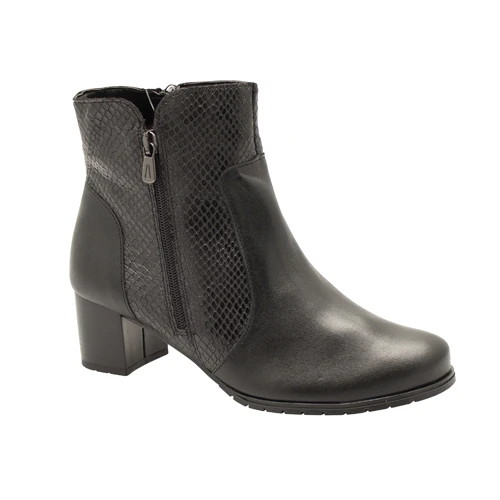 Elegant ankle boot with soft leather uppers and stylish snake print detail. Zip provides easy access. Lightweight rubber outsole.