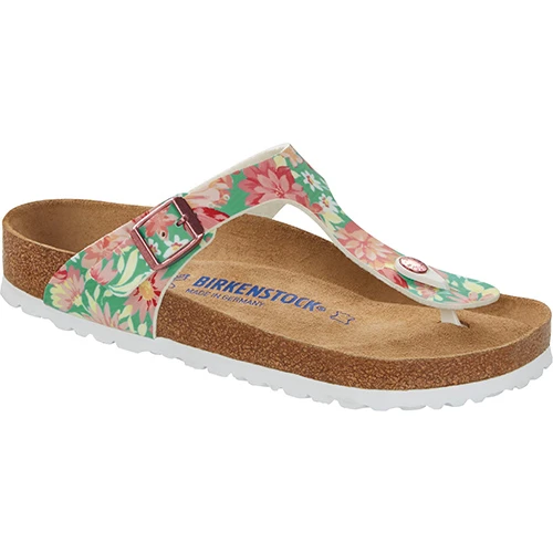 Pretty toe post sandal with a feminine floral print and stylish buckle fastening offering adjustment. The skin friendly Birko Flor upper is soft and skin friendly. The soft, suede covered footbed provides extra cushioning together with the anatomically shaped design for excellent support.