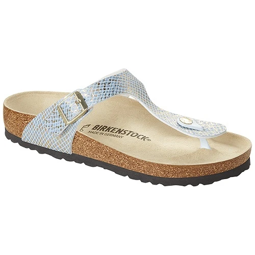 The BIRKENSTOCK Gizeh is a genuine classic. In their enchantingly shimmering “shiny snake” version, these thong sandals exude elegance with a touch of extravagance. BIRKENSTOCK has used the exceptionally skin-friendly and hard-wearing synthetic material Birko-Flor® and added an iridescent metallic coating in an elegant snakeskin look.