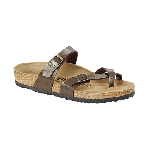 Birkenstock Mayari comtemporary style sandal. Dual straps offer easy adjustment and a supportive toe loop. Skin friendly, hard-wearing Birko-Flor uppers are soft and flexible. Anatomically shaped cork-latex footbed with a soft suede top cover provides all day comfort and support.