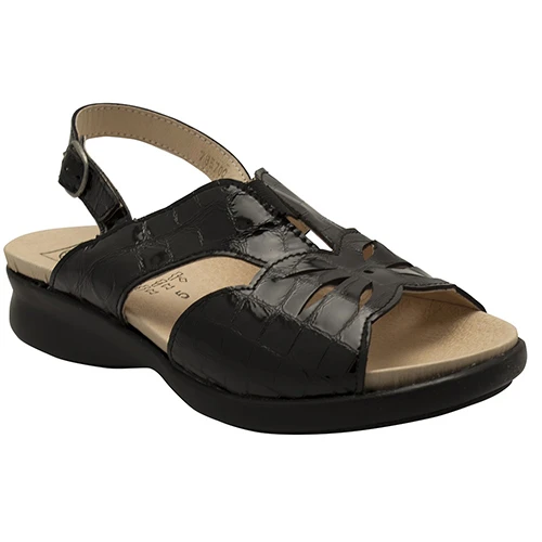 Butterfly is a comfortable and supportive sandal with rich leather uppers and smooth leather linings. It has a buckle fastening and a discreet elastic panel which provides adjustment of fit. The footbed can be removed and replaced with an orthotic if desired. Variable fit – EE to 4E extra wide to extra wide and deep. Durable rubber outsole.