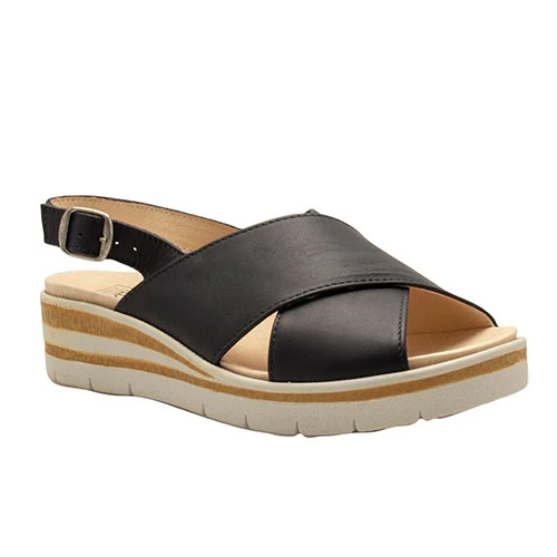 Sculptured wedge sandal with an adjustable back strap for a securer fastening. Soft leather uppers in a cross over pattern provide an easy on fit and offer excellent foot coverage. Lightweight shock absorbent sole features a detachable leather “air cushioined” insole allowing you to use your orthotics if required