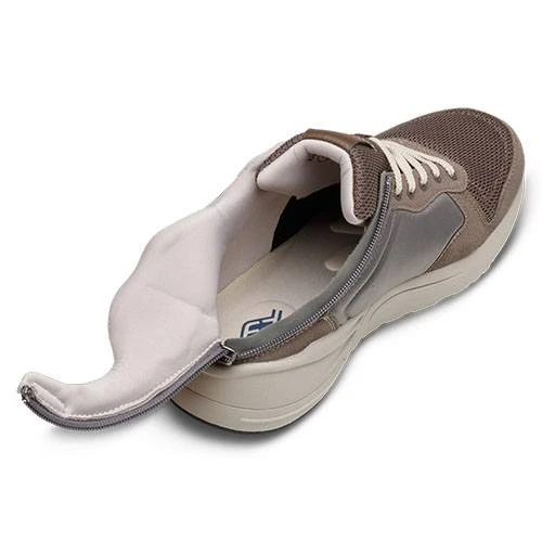 The Excursion benefits from hassle-free on-and-off. The patented Easy Shoe Access creates larger entry portals and is easier to pull than straight, lateral or wrap-around zippers. The wide-expanding upper and generous toe-box depth. Great for accommodating wider feet, swelling, orthotics and AFO/SMO. The Zip has a soft inside cover to protect from the foot, and the laces can be used to adjust the fit of the shoe.
