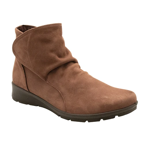 Stylish ruched ankle boot with suede uppers. Dual touch fastening straps allow the boot to open out for easy access.