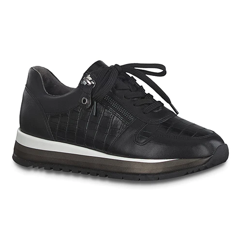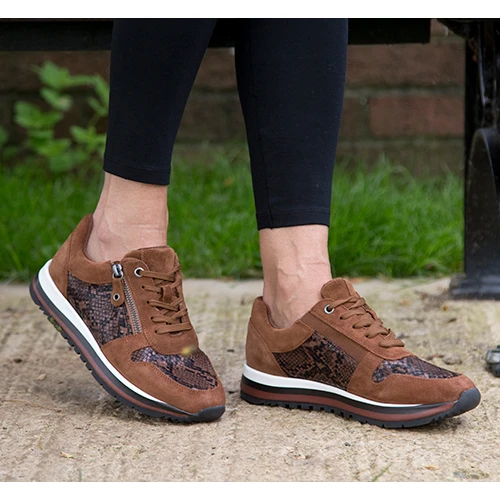 Casual trainer with premium leather uppers and snake print detail. Laces provide adjustment with the added benefit of a zip for easy access. Durable outsole.