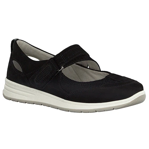 Mary Jane casual with breathable textile uppers and linings. Supportive hook and loop strap provides adjustment. Lightweight rubber outsole.