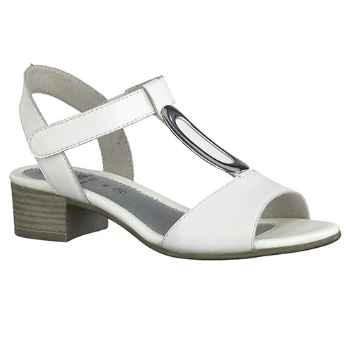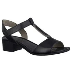 Low heel dress sandal with soft leather uppers and smooth microfibre linings. Hook and loop strap provides adjustment. Lightweight rubber outsole.