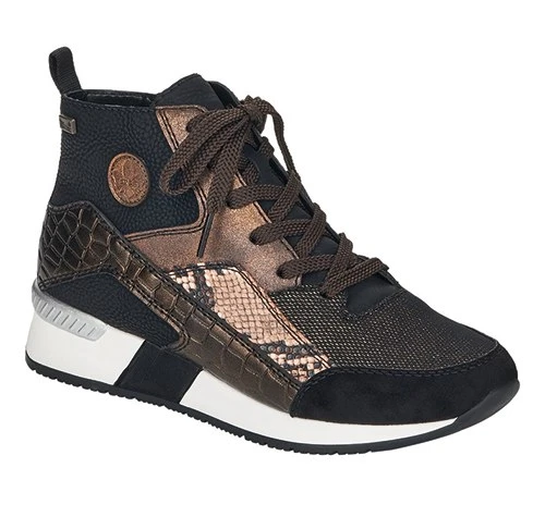 A wedged trainer with a trendy combo of colour and either snake or leopard prints. This high top is a show stopper with a waterproof synthetic upper and removable cushioned insole.