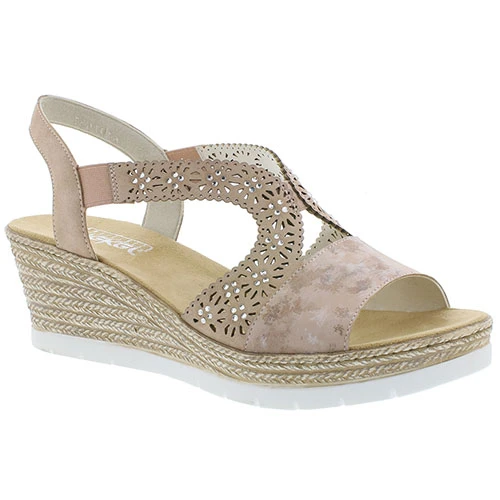 Slip on wedge sandal in choice of uppers pattern, on trend leopard or subtle pink with perforated strap detailing. Dual elastic side panels provide adjustment. Rieker anti stress footbed provides cushioning and pressure relief.