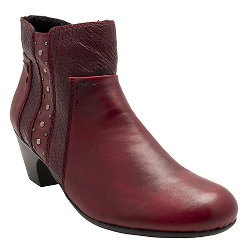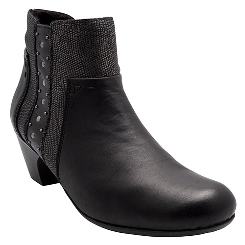 Ankle boot with leather uppers and contrast lizard print panels with stud detailing. Zip fastening for easy access.