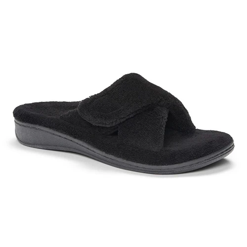 Mule style slipper with an adjustable hook and loop closure for a customised, easy on fit. Terrycloth footbed and upper surrounds your foot in softness. Biomechanically contoured arch support and deep heel cup to provide natural alignment. Durable rubber outsole with wave-patterned tread designed for indoor use.